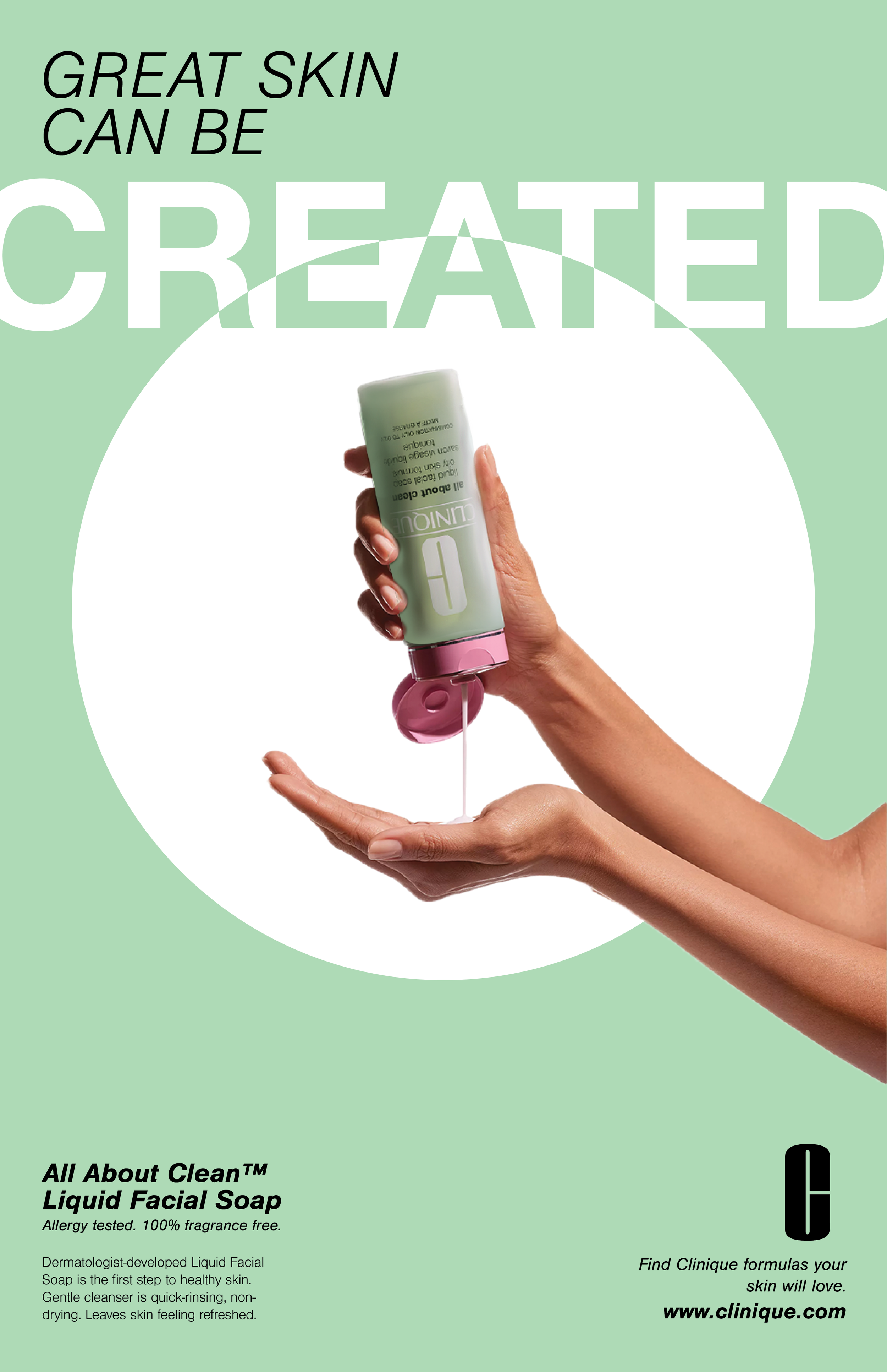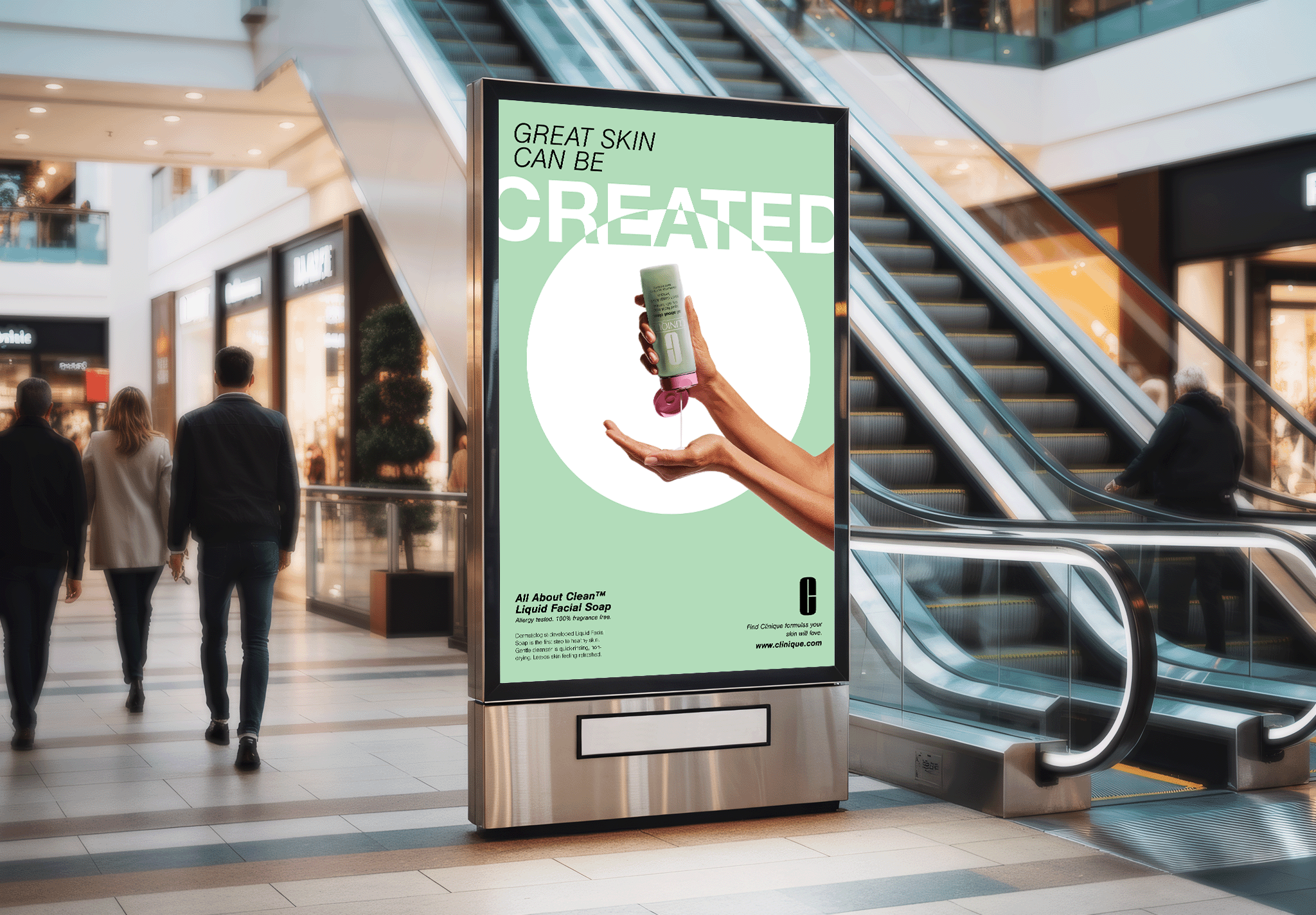 A poster advertisement showcasing a popular Clinique product, using the brand’s clean, minimal aesthetic. The design draws on Clinique’s iconic branding through a simple, balanced layout, refined typography, and a strong focus on clarity and sophistication.
