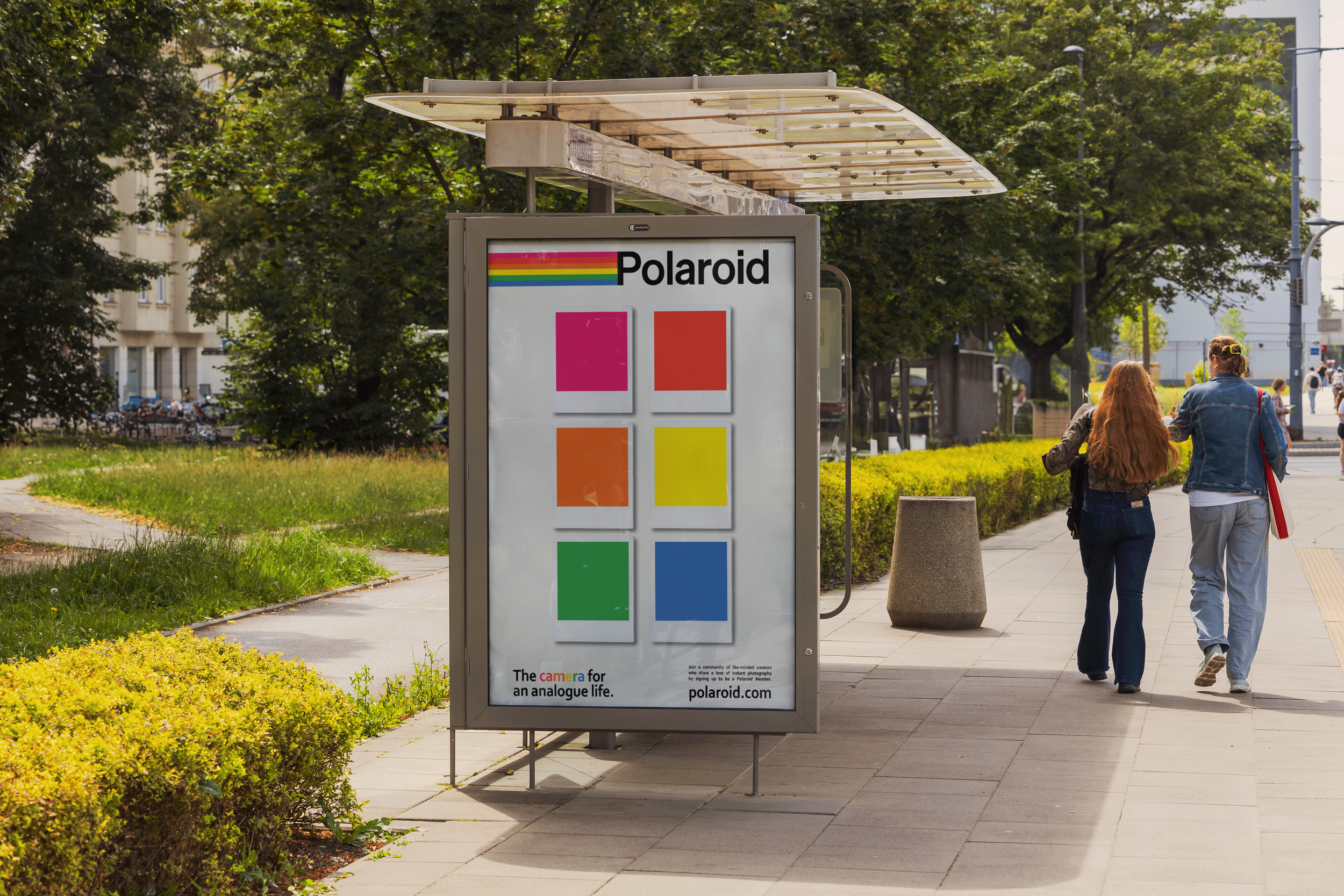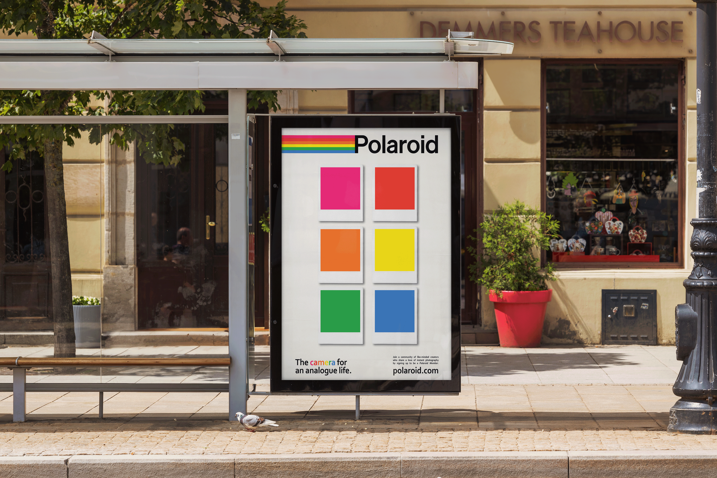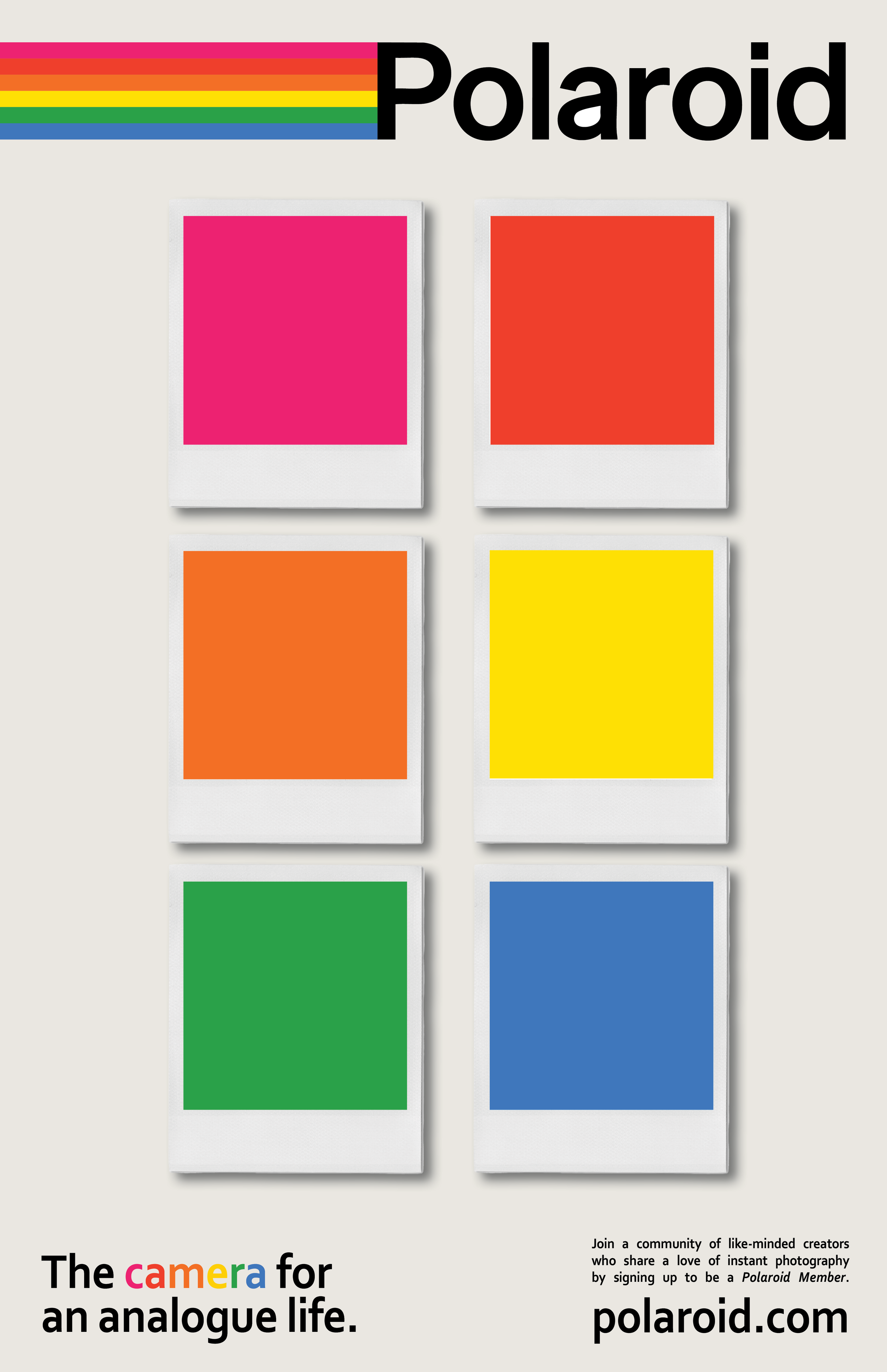 A poster advertisement showcasing Polaroid, centered around the brand’s vibrant and recognizable color palette. The design uses a grid of Polaroid frames filled with bold, saturated colors, referencing the iconic rainbow spectrum while mimicking the look of instant film.