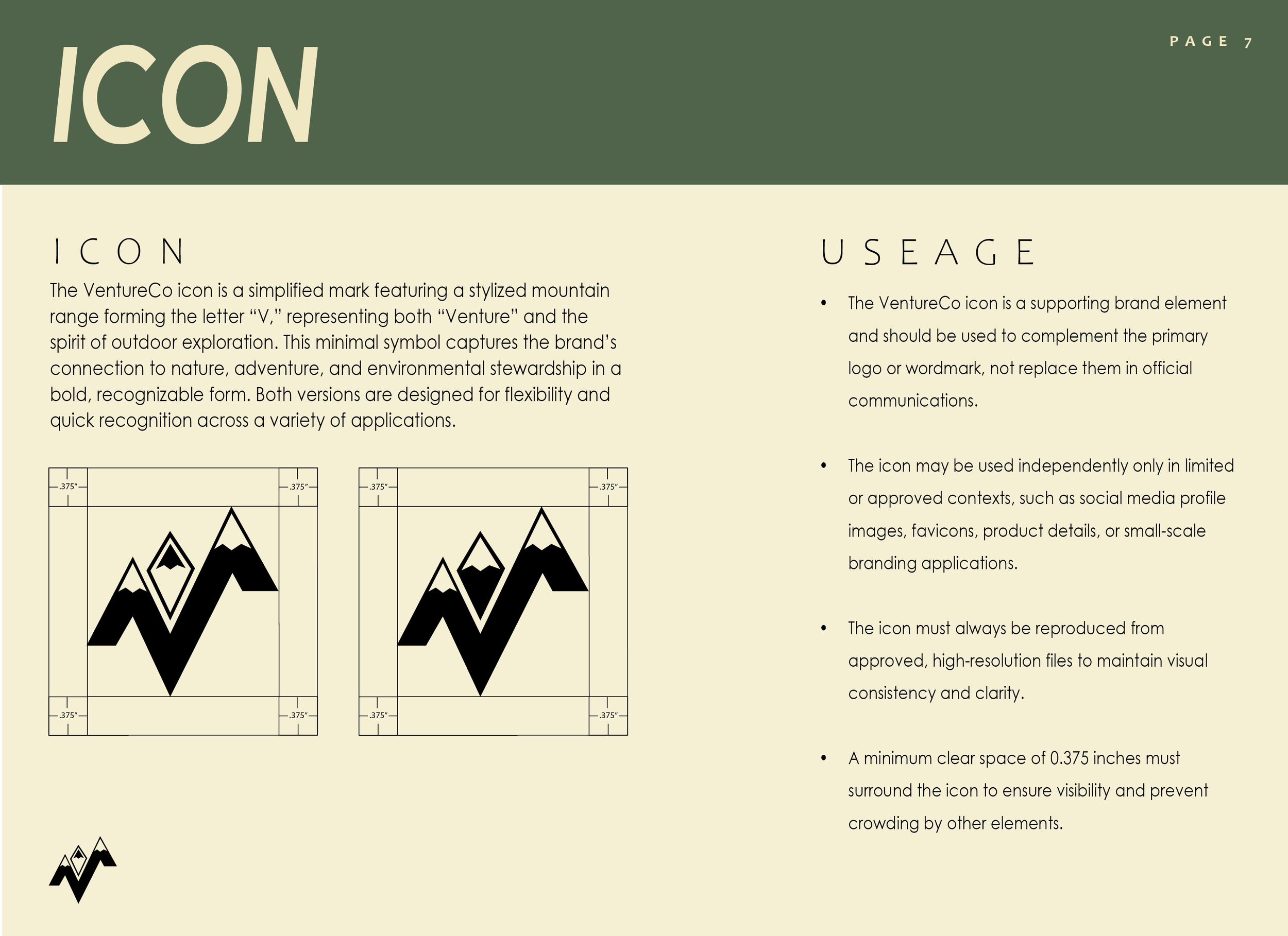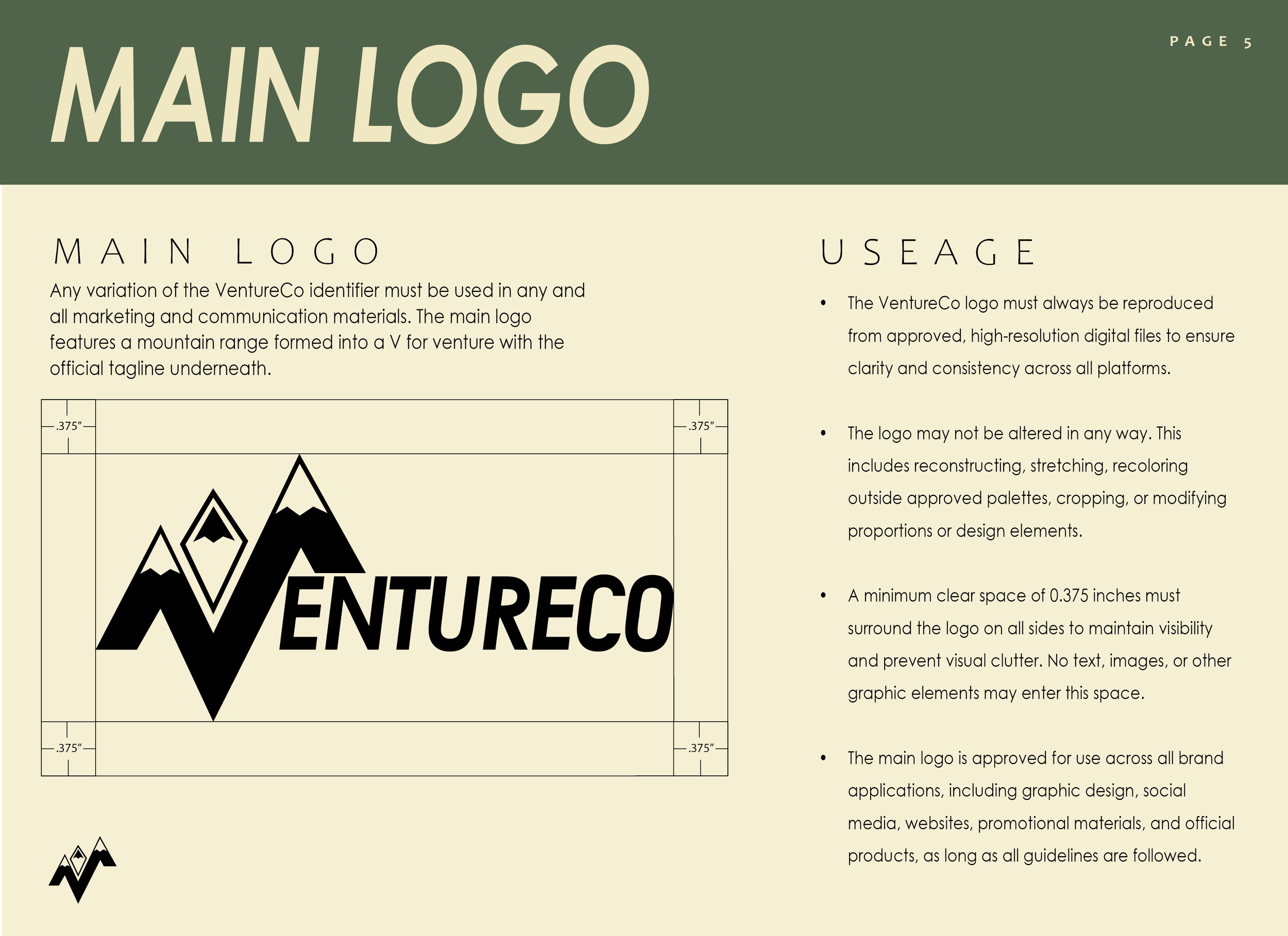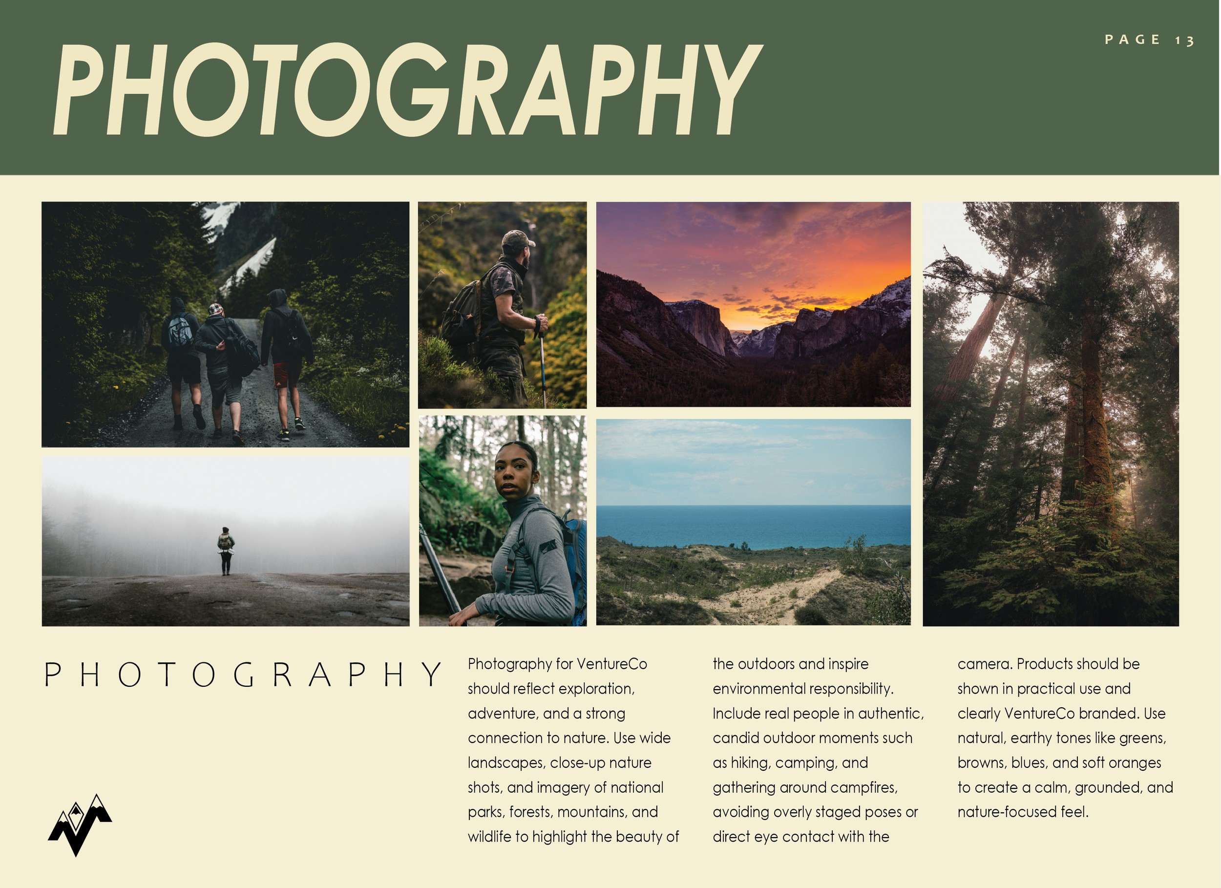 This project was developed as an opportunity to explore branding by creating a complete visual identity for a fictional company from the ground up, including its system, tone, and supporting details. VentureCo is a conceptual outdoor brand that offers gear, clothing, and accessories for hikers, campers, climbers, and nature enthusiasts who value the outdoors and environmental responsibility.